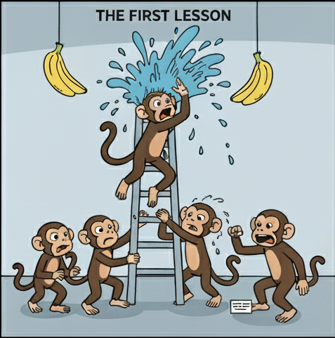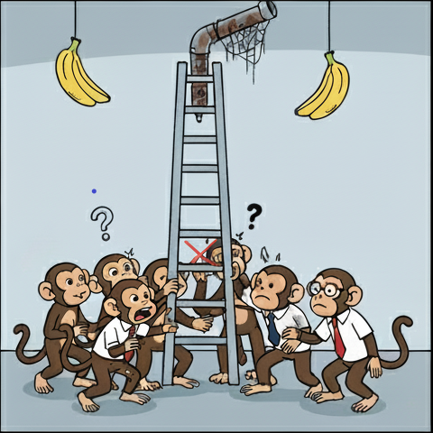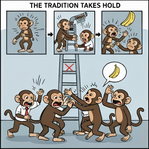 Why does this waste persist? Consider the "experiment"of the monkeys and the water spray. Scientists cage five monkeys with a ladder and bananas. When one climbs, all are sprayed with cold water. Soon, the monkeys police themselves, beating any monkey that attempts to climb. One by one, the original monkeys are replaced. The new monkeys, never having been sprayed, enthusiastically join in the beatings. Eventually, no monkey who was ever sprayed remains, yet all of them enforce a rule whose purpose is completely unknown.